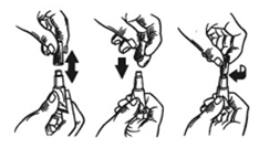 Ta ur en pipett ur förpackningen. Håll pipetten upprätt, vrid och dra av huven. Vänd huven och använd den att vrida av och avlägsna pipettens försegling, se bild.