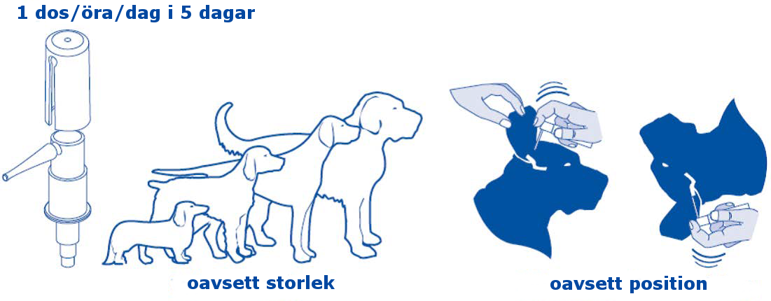 Innan behandling bör den yttre hörselgången rengöras och torkas, samt överflödigt hår runt behandlingsområdet klippas bort. Den rekommenderade dosen är 1 ml av läkemedlet per infekterat öra, en gång om dagen i fem på varandra följande dagar.