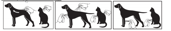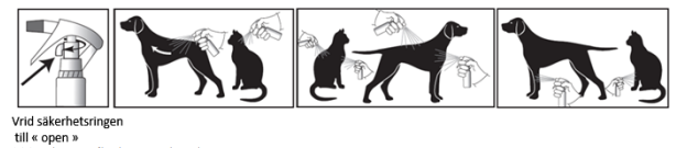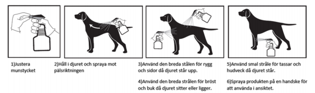 Spraya kroppen på djuret från ett avstånd på 10-20 cm. Spraya mot pälsriktningen och se till att hela pälsen blöts. Rugga upp pälsen särskilt på djur med lång päls så att produkten når ner till huden. För behandling av huvudregionen samt då unga eller oroliga djur behandlas kan behandling ske genom att spraya produkten på en handske och sedan gnugga in produkten i pälsen. Låt pälsen lufttorka. Torka inte med hjälp av handduk.