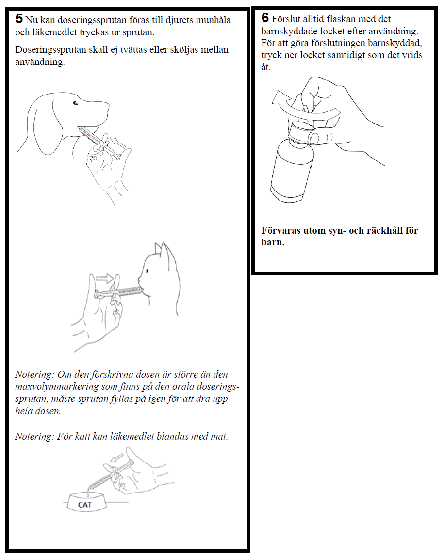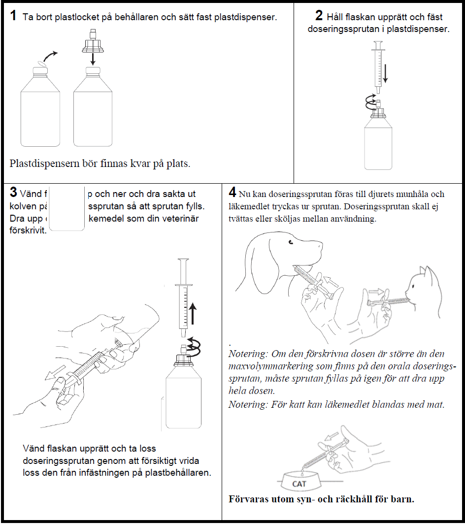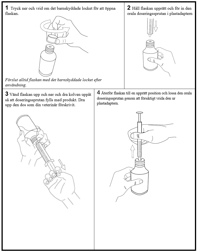 För flaskor med 30 eller 50 ml kan antingen den 1 ml orala sprutan (graderad varje 0,05 ml) eller den 3 ml orala sprutan (graderad vardera 0,1 ml) användas för att uppnå den angivna dosen, bestämd enligt kroppsvikt.