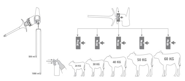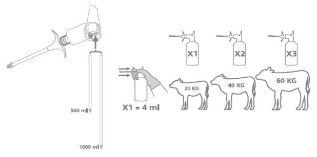 Tryck in doseringspumpens avtryckare fullständigt för att ge en dos som motsvarar 4 ml lösning. Tryck två eller tre gånger för att administrera den önskade mängden (8 ml för kalvar på 35 – 45 kg respektive 12 ml för kalvar på 45 – 60 kg).