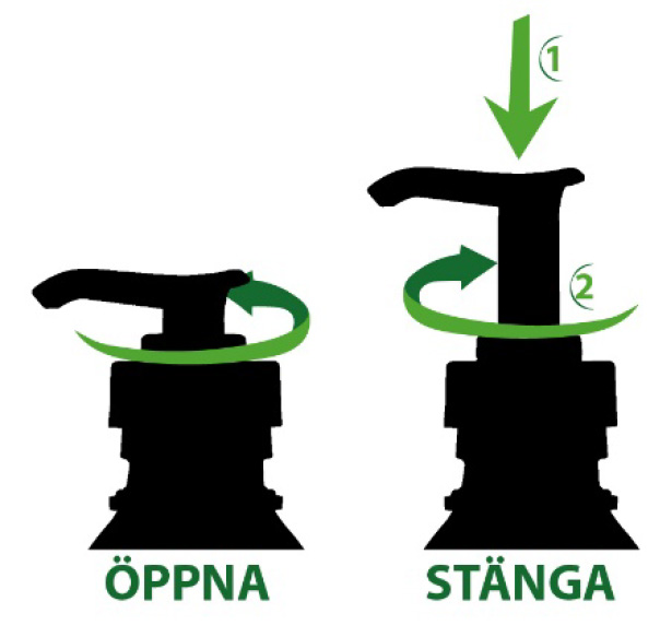 Pumpen måste primas två gånger före användning. Fortsätt behandlingen tills de kliniska symtomen har försvunnit, men använd inte läkemedlet i mer än 12 dagar. För att öppna enheten, vrid snäpplocket som visas upptill. Efter varje användning stänger du enheten genom att vrida snäpplocket i motsatt riktning.