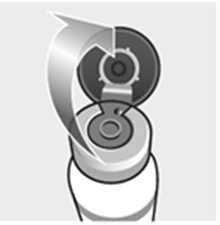 Tryck med tummen och tryck flaskans lock uppåt under den präglade triangeln för att ge åtkomst till gummiproppen.
