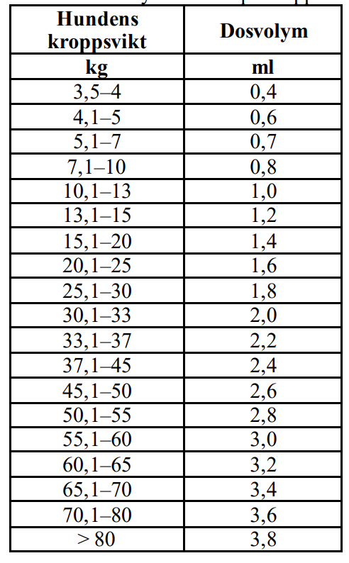 Beräkna dosen med 1 mg/m2 medetomidin eller använd nedanstående doseringstabell. Observera att dosen i mg/kg minskar när kroppsvikten ökar. Användning av en lämpligt graderad spruta rekommenderas för att säkerställa korrekt dosering när små volymer administreras.