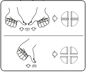 Tabletterna kan delas i två och fyra lika stora delar för att säkerställa korrekt dosering. Placera tabletten på en plan yta, med den skårade sidan uppåt och den konvexa (rundade) sidan mot ytan.