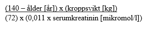 Om beräknat kreatininclearance (Schwartz) överstiger 150 ml/min/1,73 m2, ska ett maximalt värde på 150 ml/min/1,73 m2 användas i ekvationen: