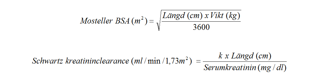 Pediatrisk dos (mg) = 3 x BSA x ClcrS (se Mostellers BSA formel och Schwartz kreatininclearance-formel nedan).