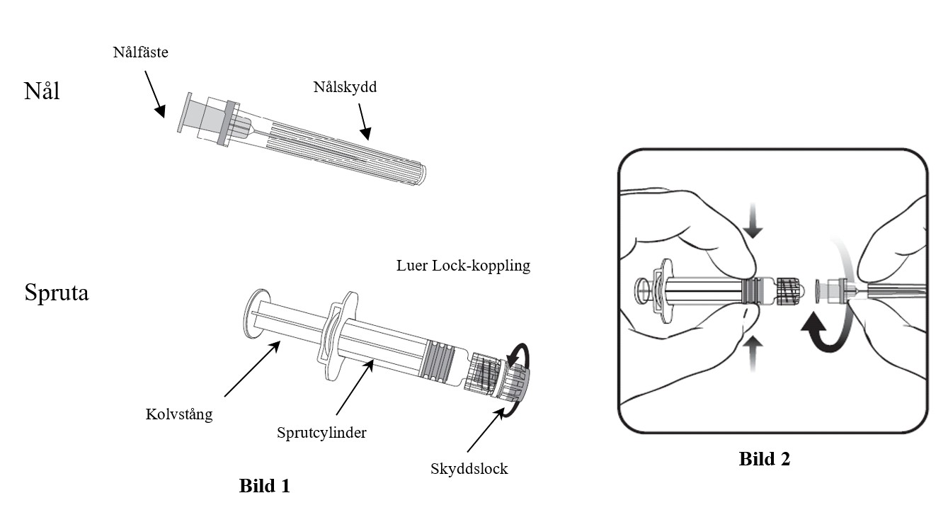 Läs noggrant instruktionerna som ges till bilderna 1 och 2 när nålen ska fästas på sprutan.