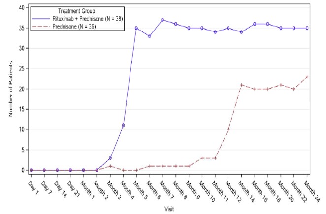 Patienterna stratifierades med utgångspunkt i sjukdomens svårighetsgrad (måttlig eller svår) och randomiserades 1:1 för att få antingen MabThera och lågdos prednison eller standarddos prednison.