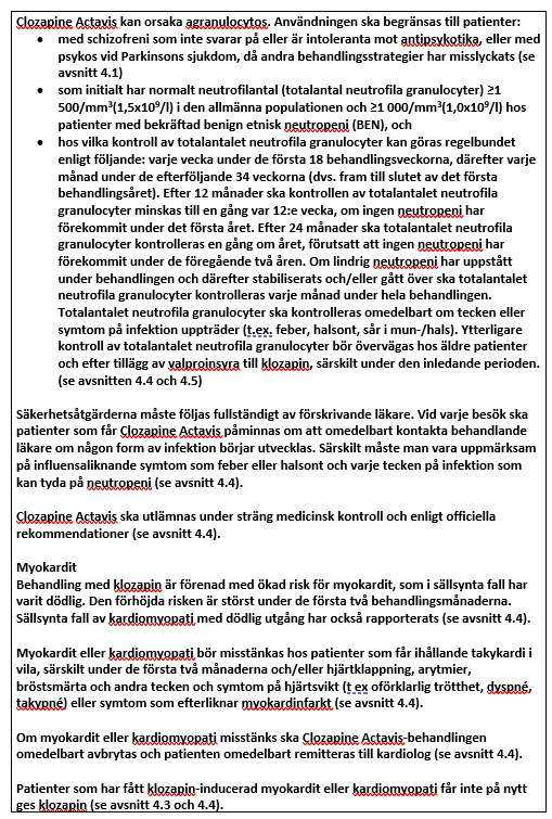 Klozapin kan orsaka agranulocytos. Incidensen av agranulocytos och risken för dödligt förlopp har avtagit markant sedan kontroll av totalantalet neutrofila granulocyter infördes. Följande försiktighetsåtgärder är därför obligatoriska och ska följas i enlighet med de officiella rekommendationerna.