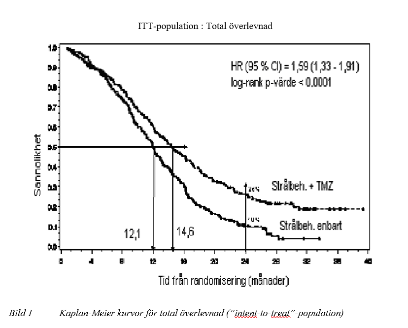 Hazard ratio (HR) för total överlevnad var 1,59 (95 % CI för HR=1,33 - 1,91), log-rank p < 0,0001 med fördel för TMZ-armen. Den uppskattade sannolikheten att överleva 2 år eller mer (26 % vs 10 %) är högre för armen med strålbehandling + TMZ. Tillägg av samtidig TMZ till strålbehandling följt av TMZ som monoterapi vid behandlingen av patienter med nydiagnostiserad glioblastoma multiforme visade en statistiskt signifikant förbättring av den totala överlevnaden jämfört med enbart strålbehandling (bild 1).