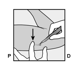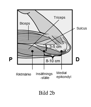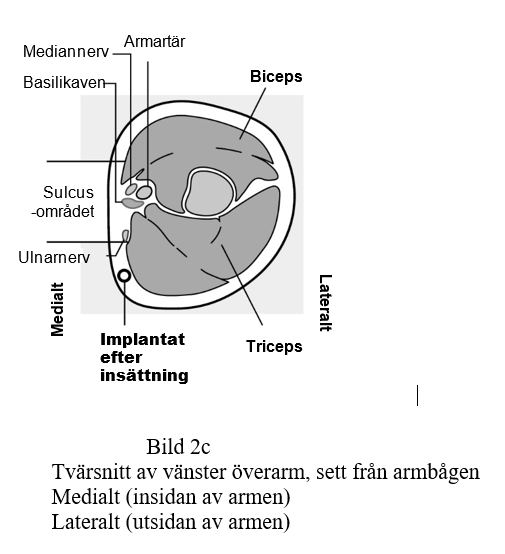Nexplanon-implantatet ska sättas in subdermalt PRECIS UNDER HUDEN på insidan av den icke‑dominanta överarmen. Insättningsstället är över tricepsmuskeln cirka 8-10 cm (3‑4 tum) från den mediala epikondylen av humerus och 3-5 cm (1,25-2 tum) posteriort om (under) sulcus (fördjupning) mellan biceps- och tricepsmusklerna. Denna plats väljs för att undvika stora blodkärl och nerver i och runt sulcus (se Bild 2a, 2b och 2c).