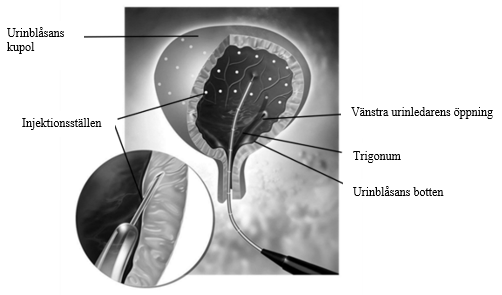 Före injektionen ska urinblåsan instilleras med tillräcklig mängd natriumkloridlösning 9 mg/ml (0,9% injektionsvätska) för att uppnå adekvat visualisering vid injektionerna.