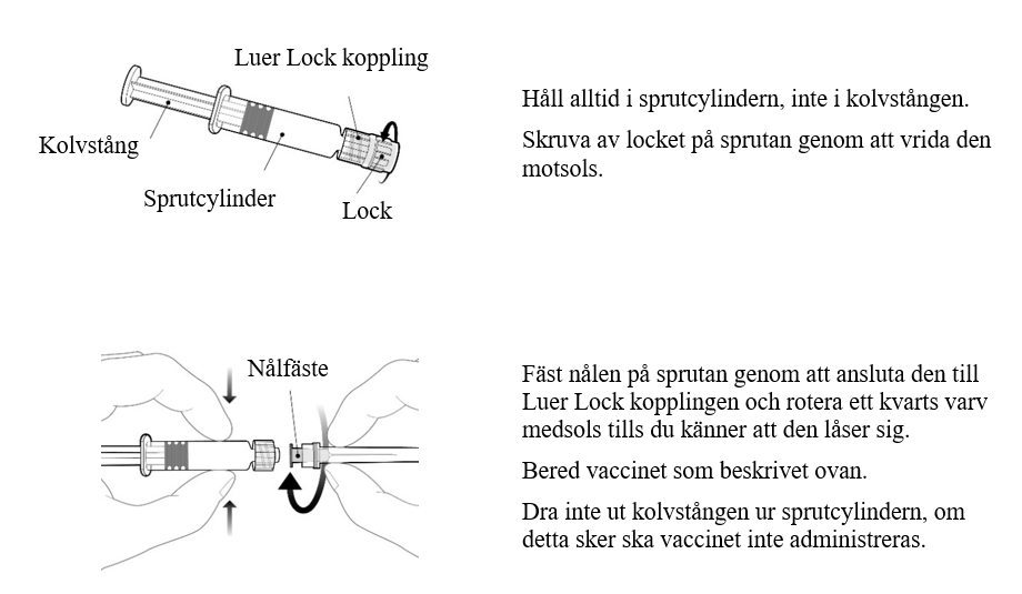 Vaccinet bereds genom att hela innehållet i den förfyllda sprutan överförs till injektionsflaskan med pulvret. Före administrering ska blandningen omskakas tills pulvret är helt upplöst.