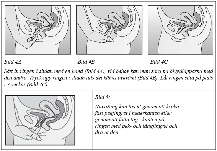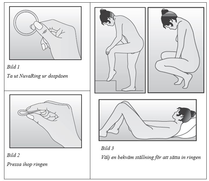 Hur man använder NuvaRingKvinnan kan själv föra in NuvaRing i slidan. Läkaren/barnmorskan ska informera kvinnan om hur hon ska sätta in och ta ut NuvaRing. För insättningen ska kvinnan välja den ställning som är mest bekväm för henne, t ex stå med ett ben upphöjt, sitta på huk eller ligga ner. NuvaRing ska pressas ihop och föras in i slidan tills det känns bekvämt (se bild 1-4). Ett valfritt alternativ är att sätta in ringen genom att använda NuvaRing Applikator som tillhandahålls separat eller är inkluderad i förpackningen. NuvaRing Applikator kommer eventuellt inte att vara tillgänglig i alla länder. Den exakta positionen i slidan är inte avgörande för effekten.