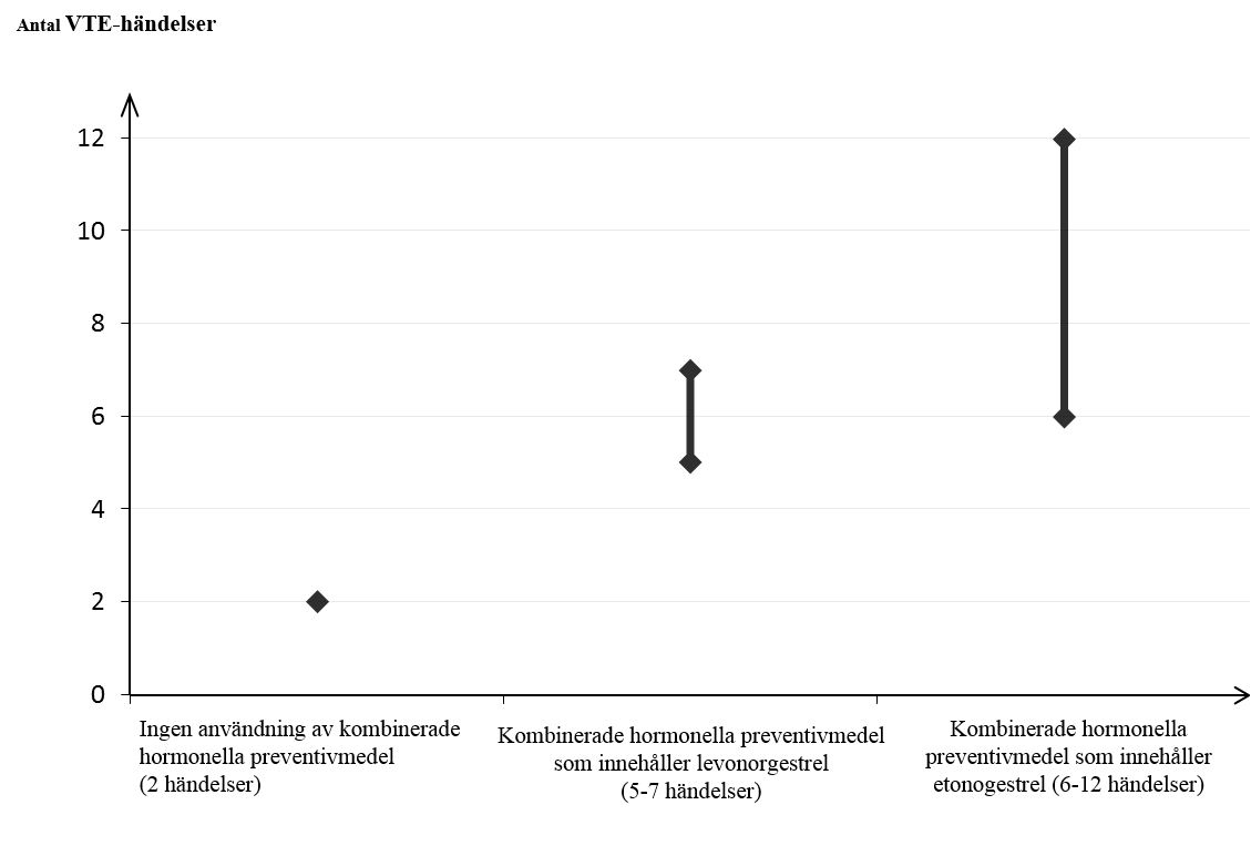 1Genomsnittsintervallet är på 5-7 per 10 000 kvinnoår, baserat på en relativ risk för kombinerade hormonella preventivmedel som innehåller levonorgestrel jämfört med en icke användning på cirka 2,3 till 3,6