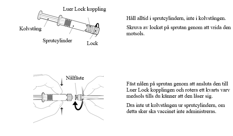 Instruktion för resuspension av vaccinet till en homogen, grumlig vit suspension