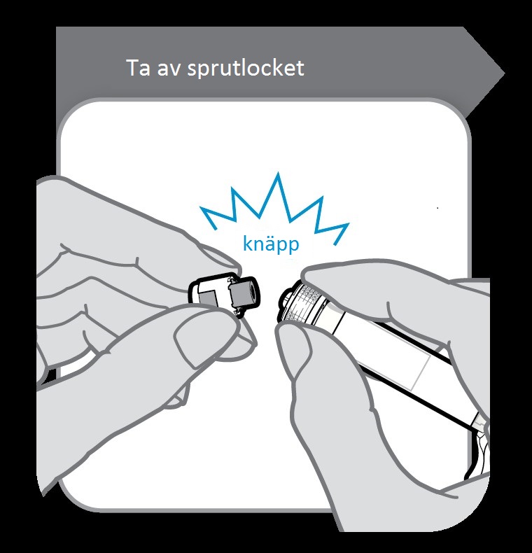 Bryt av sprutlocket. Sprutan ska hållas upprätt för att undvika läckage och sprutans ände får inte vidröra något.