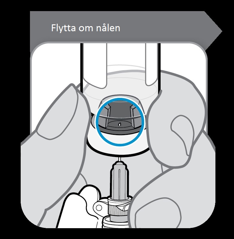 Dra nålen nedåt så att nålspetsen är vid sin lägsta punkt i vätskan. Dra försiktigt ut kolven i sprutan för att dra ut läkemedlet ur injektionsflaskan. Om luft syns i sprutan ska du knacka på sprutcylindern så att bubblorna stiger uppåt och sedan försiktigt trycka ut bubblorna i injektionsflaskan.