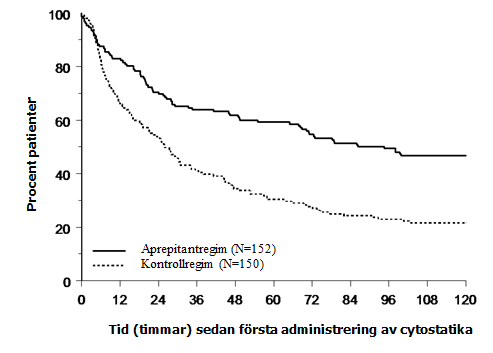 Den uppskattade tiden till första emesis efter påbörjande av cytostatikabehandling var längre vid aprepitantregimen (uppskattad mediantid till första emesis var 94,5 timmar) jämfört med kontrollregimen (uppskattad mediantid till första emesis var 26,0 timmar) vilket visas i Kaplan‑Meierkurvorna i figur 2.