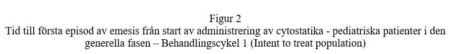 † Illamående och kräkningar var effektparametrar under de 5 första dagarna efter cytostatikabehandling och rapporterades bara som biverkningar därefter.