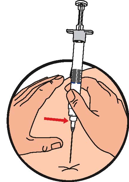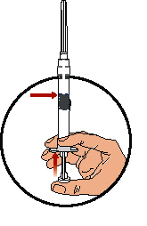 Håll sprutan i upprätt ställning, med injektionsnålens spets uppåt. Tryck in kolven långsamt tills den mellersta gummiproppens främre del når den blå linjen mitt på sprutan, detta skall ta ca 6-8 sek (Bild 2).