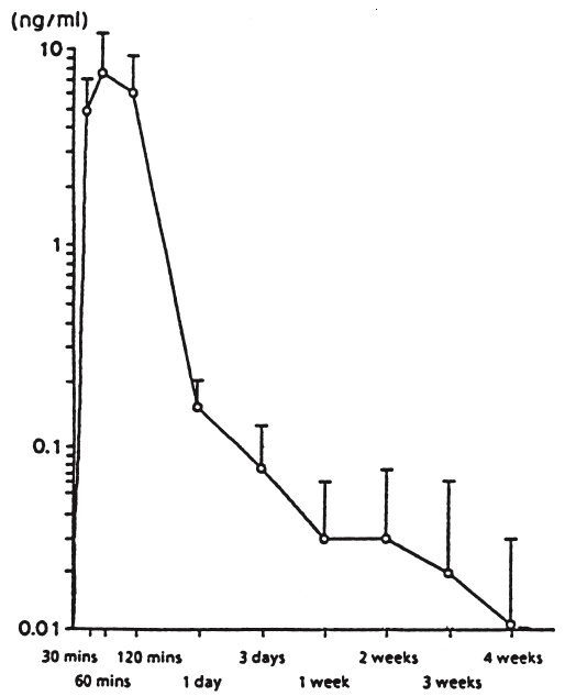Bild 1 visar serumnivåerna för leuprorelin efter en subkutan administration av leuprorelinacetat depot vid doser på 30 mikrogram/kg kroppsvikt. Maximala serumnivåer uppnåddes 60 minuter efter administrering (7,81 ± 3,59 ng/ml). AUC0-672 är 105,78 ± 52,40 ng x timme/ml.