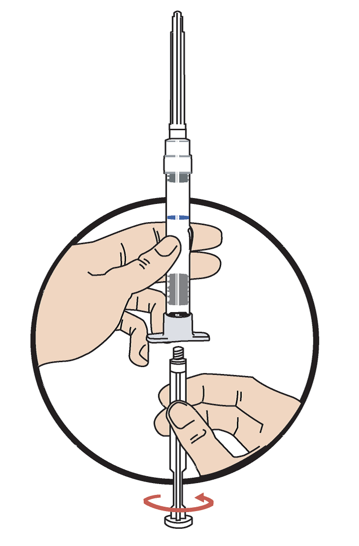 För att förbereda för en injektion skruvas den vita kolven fast i injektionssprutans botten tills den bakre gummiproppen börjar snurra (Bild 1). Nålen ska vara ordentligt fastskruvad på sprutan. Knacka på sprutan så att eventuellt pulver lossnar från kammarens vägg.