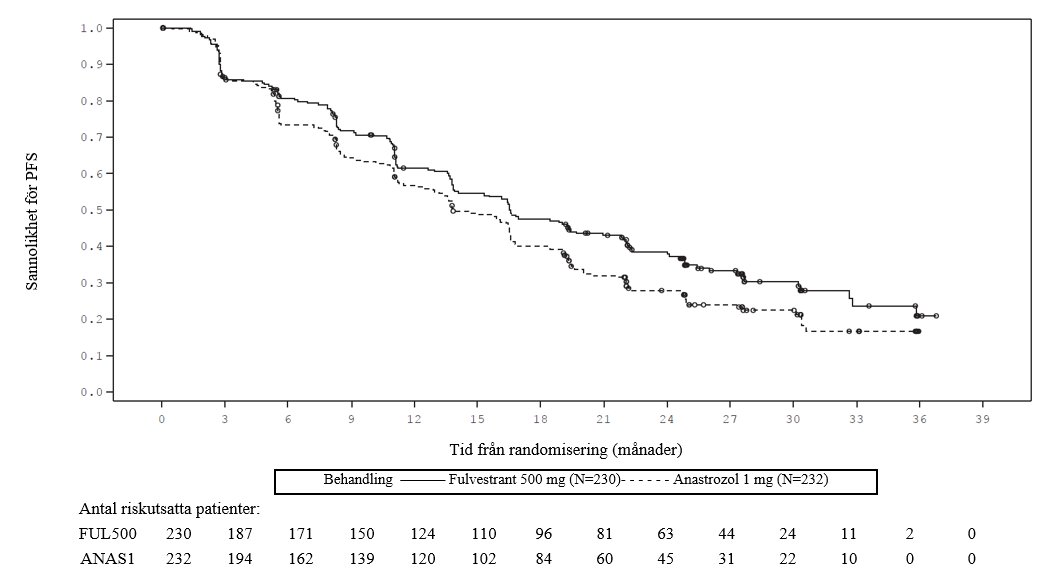 En fas 3, randomiserad, dubbelblind, dubbelplacebo, multicenterstudie av Faslodex 500 mg jämfört med anastrozol 1 mg utfördes på postmenopausala kvinnor med ER-positiv och/eller PgR‑positiv lokalt avancerad eller metastatisk bröstcancer som inte tidigare behandlats med någon hormonell behandling. Totalt randomiserades 462 patienter 1:1 i följd att få antingen fulvestrant 500 mg eller anastrozol 1 mg.