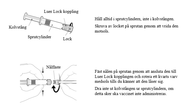 Före administration ska vaccinet omskakas väl för att erhålla en nästan genomskinlig, vitaktig suspension.