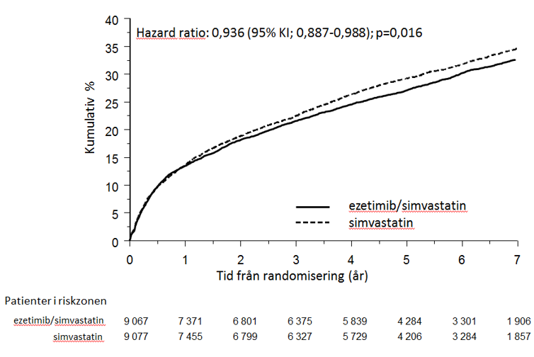 Det primära effektmåttet var sammansatt och bestod av kardiovaskulär död, allvarliga kardiovaskulära händelser (definierade som icke-fatal hjärtinfarkt, dokumenterad instabil angina som krävde sjukhusinläggning eller koronar revaskularisering minst 30 dagar efter randomisering) och icke-fatal stroke. Studien visade positiv effekt av behandling med Inegy på det primära effektmåttet sammansatt av kardiovaskulär död, allvarliga kardiovaskulära händelser och icke-fatal stroke jämfört med behandling med enbart simvastatin (relativ riskreduktion på 6,4 %, p = 0,016). Det primära effektmåttet inträffade hos 2 572 av 9 067 patienter (7 års Kaplan-Meier [KM]-värde 32,72 %) i Inegy-gruppen och 2 742 av 9 077 patienter (7 års KM-värdet 34,67 %) i gruppen med enbart simvastatin. (Se bild 1 och tabell 2.) Total mortalitet var oförändrad i denna högriskgrupp (se tabell 2).