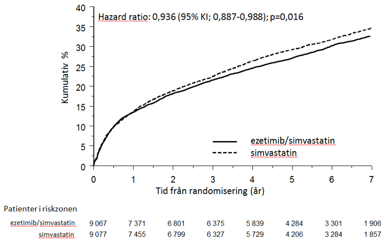 Den primära effektmåttsanalysen visade att Inegy signifikant minskade risken för allvarliga vaskulära händelser (749 patienter med händelser i placebogruppen jämfört med 639 i Inegy-gruppen) med en relativ riskminskning på 16 % (p = 0,001).