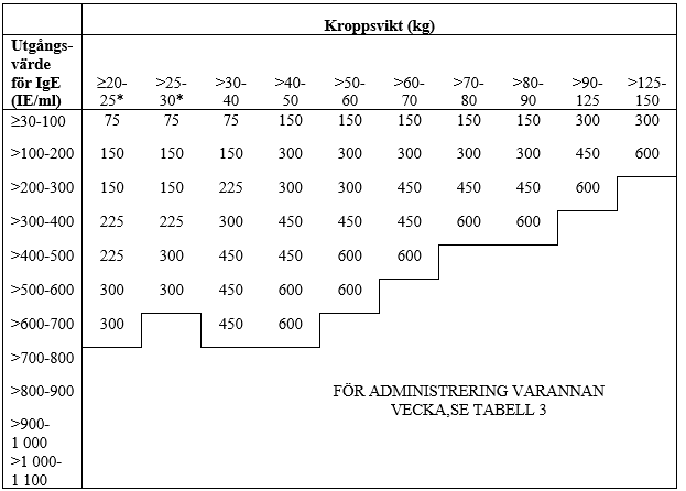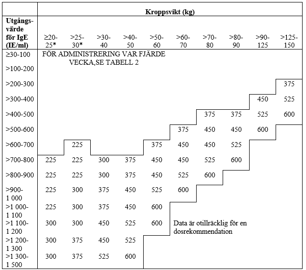 Tabell 2 ADMINISTRERING VAR FJÄRDE VECKA. Dosering av omalizumab (milligram per dos) som ges genom subkutan injektion var fjärde vecka