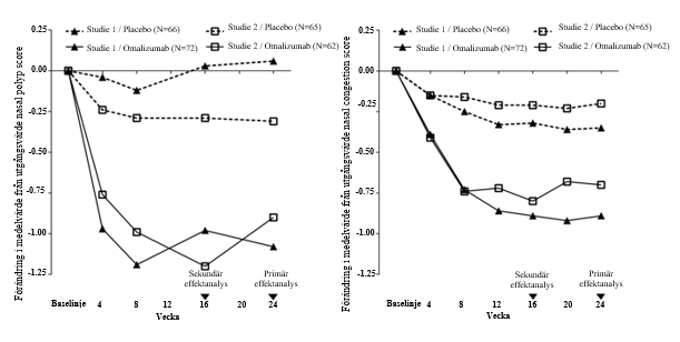 De kombinerade-primära effektmåtten var poäng bilateral ”nasal polyp score” (NPS) och genomsnittlig daglig ”nasal congestion score” (NCS) vid vecka 24. I båda studierna 1 och 2 vid näspolyper hade patienter som fick omalizumab statistiskt signifikant större förbättringar från utgångsvärdet vid vecka 24 i NPS och genomsnittlig NCS per vecka än patienter som fick placebo. Resultat från studierna 1 och 2 vid näspolyper visas i tabell 8.