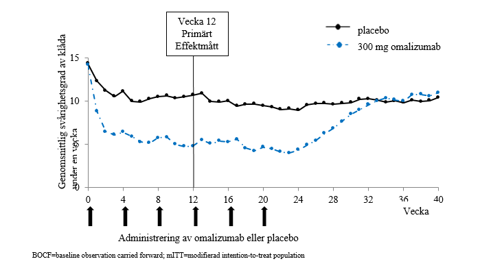 Det primära effektmåttet var förändring av svårighetsgrad av klåda under en vecka från utgångsvärdet till vecka 12. Med 300 mg omalizumab minskade svårighetsgraden av klåda med 8,55‑9,77 (p<0,0001) jämfört med en minskning med 3,63‑5,14 för placebo (se tabell 9). Även UAS7 ≤6 (vid vecka 12) var statistiskt signifikant och 300 mg gav ett bättre behandlingssvar på 52‑66 %, jämfört med 11‑19 % för placebo (p<0,0001). Fullständigt svar (UAS7 =0) uppnåddes hos 34‑44 % av patienterna som behandlades med 300 mg, jämfört med 5‑9 % av patienterna som fick placebo (p<0,0001). Patienter som fick 300 mg uppnådde den högsta genomsnittliga andelen dagar utan angioödem från vecka 4 till vecka 12 (91,0‑96,1 %, p<0,001) jämfört med motsvarande placebogrupper (88,1‑89,2 %). Genomsnittlig förändring av total livskvalitet, mätt med DLQI från utgångsvärdet till vecka 12, var större för 300 mg än för placebo (p<0,001) och visade en förbättring på 9,7‑10,3 poäng, jämfört med 5,1‑6,1 poäng för motsvarande placebogrupper.