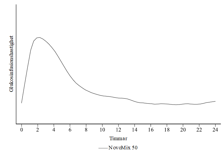 När NovoMix 50 injiceras subkutant, sker anslaget inom 10–20 minuter efter injektionen. Den maximala effekten uppnås 1–4 timmar efter injektionen och durationen är 14–24 timmar (Figur 1).