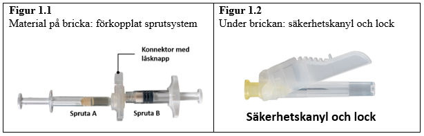 Tryck ut alla stora luftbubblor från spruta B före administrering. Administrera produkten subkutant och håll samtidigt säkerhetshöljet ifrån kanylen.