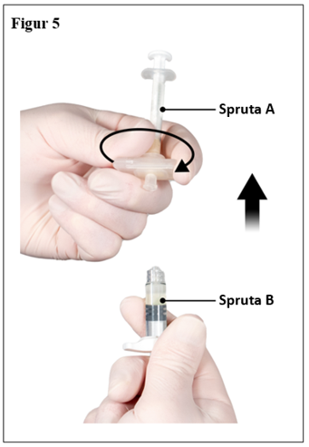 Medan kolven på spruta A hålls fortsatt nedtryckt, håll konnektorn och skruva loss den från spruta B. Spruta A kommer fortsätta vara ansluten till konnektorn (figur 5). Se till att ingen produkt läcker ut eftersom kanylen i sådana fall inte kommer att fästa säkert när den sätts på.