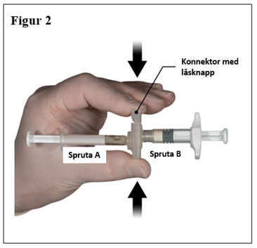 Ta tag i låsknappen på konnektorn med ditt pekfinger och tumme och tryck (figur 2) tills du hör ett klickljud. De två sprutorna kommer vara placerade mot varandra. Ingen speciell montering av sprutsystemet krävs för att aktivera konnektorn. Böj inte sprutsystemet (observera att detta kan orsaka läckage eftersom du delvis kan skruva isär sprutorna).