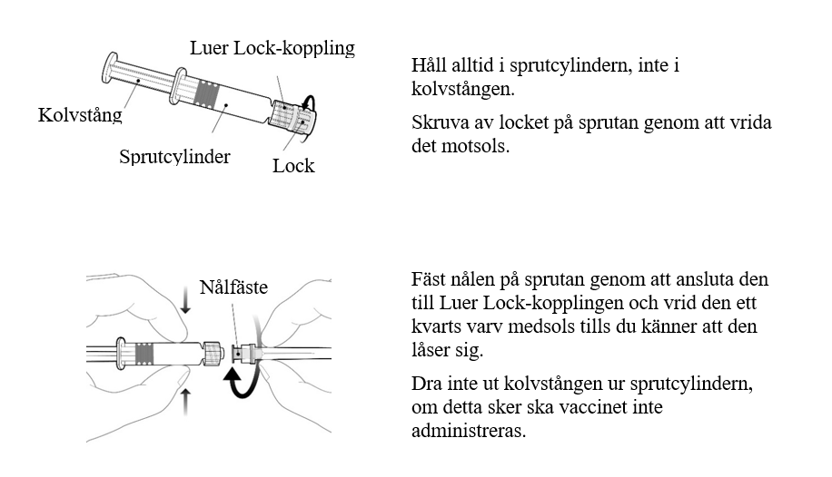 Vaccinet ska inspekteras visuellt för främmande partiklar och/eller avvikande fysikaliska förändringar före administrering. Om avvikelser observeras ska vaccinet inte administreras.
