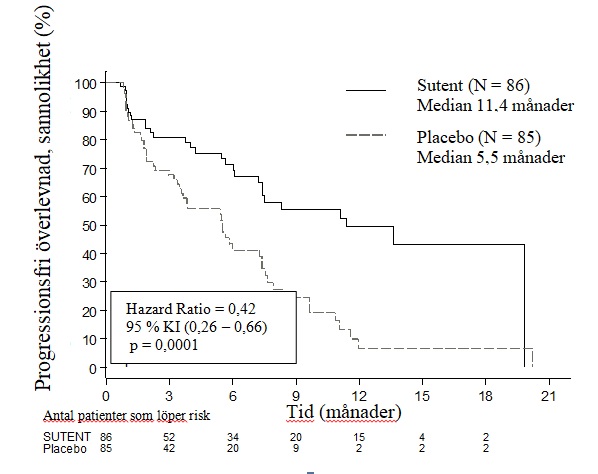 En kliniskt signifikant fördel beträffande prövarbedömd PFS för sunitinib jämfört med placebo observerades. Medianen för PFS var 11,4 månader för sunitinibarmen jämfört med 5,5 månader för placeboarmen [hazard ratio: 0,418 (95 % KI 0,263, 0,662), p-värde = 0,0001]; liknande resultat observerades då härledda tumörresponsbedömningar baserat på applicering av RECIST på prövarbedömda tumörmått användes för att bestämma sjukdomsprogressionen så som visas i tabell 4. En hazard ratio som gynnade sunitinib observerades i alla undergrupper av utvärderade utgångsegenskaper, inklusive en analys av antal tidigare systemiska terapier. Totalt 29 patienter i sunitinibarmen och 24 i placeboarmen hade inte fått någon tidigare systemisk behandling; bland dessa patienter var hazard ratio för PFS 0,365 (95 % KI 0,156, 0,857), p=0,0156. För 57 patienter i sunitinibarmen (däribland 28 med 1 tidigare systemisk terapi och 29 med 2 eller flera tidigare systemiska terapier) och 61 patienter i placeboarmen (däribland 25 med 1 tidigare systemisk terapi och 36 med 2 eller flera tidigare systemiska terapier) var hazard ratio för PFS 0,456 (95 % KI 0,264 -0,787), p=0,0036.