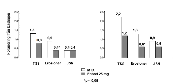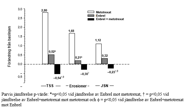 Vid vecka 12 förekom en statistiskt signifikant förbättring i SPARCC-poängen (Spondyloarthritis Research Consortium of Canada) för sakroiliakaleden (SI) mätt med MR för patienter som fick Enbrel. Justerad genomsnittlig förändring från baseline var 3,8 för patienter som behandlades med Enbrel (n=95) jämfört med 0,8 för patienter som behandlades med placebo (n=105) (p<0,001). Vid vecka 104, var den genomsnittliga förändringen från baslinjen i SPARCC poäng mätt på MRI för alla Enbrel-behandlade patienter 4,64 för SI (n = 153) och 1,40 ryggraden (n = 154).