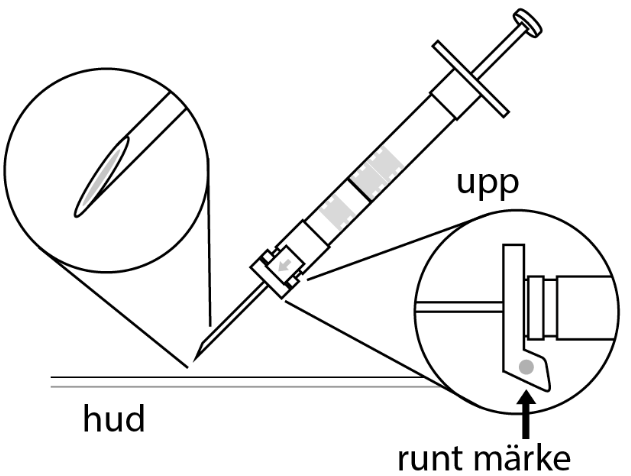 Beredning och administrering av injektionsvätskanPulver och vätska ska blandas före användning. Observera! Dra aldrig tillbaka kolven under beredning, detta kan orsaka läckage vid proppen eller vid kolven. Läs och följ nedanstående instruktioner.