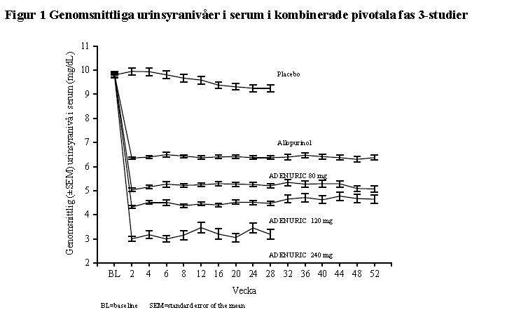 Förmågan hos ADENURIC att sänka urinsyranivåerna i serum var snabb och kvarstående. En sänkning av urinsyranivån i serum till <6,0 mg/dl (357 mikromol/l) noterades vid besöket vecka 2 och kvarstod under hela behandlingen. De genomsnittliga urinsyranivåerna i serum över tiden för varje behandlingsgrupp i de två pivotala fas 3-studierna visas i figur 1.