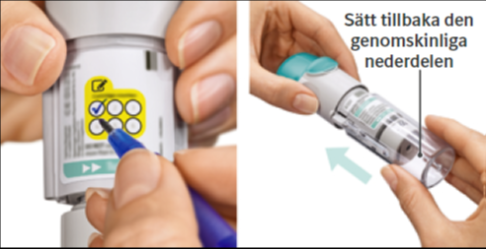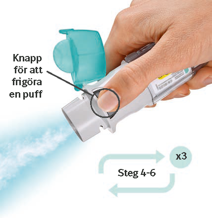 Om Spiriva Respimat inte har använts på mer än 21 dagar upprepas steg 4-6 under “Förbered för användning” tills en dimma syns. Upprepa sedan steg 4-6 ytterligare tre gånger.