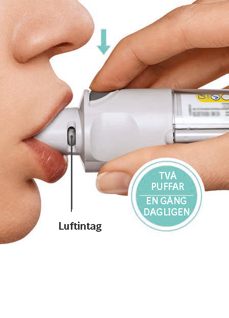 Patienten kommer att behöva använda den här inhalatorn EN GÅNG VARJE DAG. Varje gång ska TVÅ PUFFAR tas.