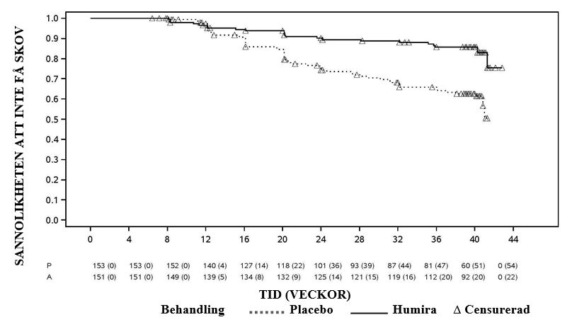 Adalimumab fördröjde signifikant tiden till behandlingssvikt i jämförelse med placebo (se figur 3, P < 0,0001 från log rank test). Mediantiden till behandlingssvikt var 24,1 veckor för patienter som behandlades med placebo, medan mediantiden till behandlingssvikt för patienter som behandlades med adalimumab inte gick att fastställa eftersom mindre än hälften av dessa patienter uppvisade behandlingssvikt. Adalimumab minskade signifikant risken för behandlingssvikt med 75 % jämfört med placebo, vilket framgår av hazardkvoten (HR = 0,25 [95 % CI: 0,12; 0,49]).