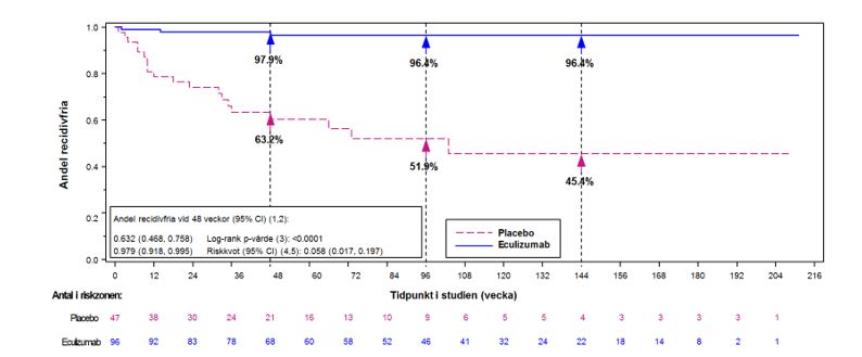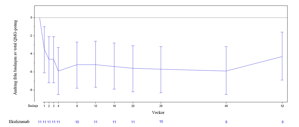En händelse med klinisk försämring (MG-kris) som krävde akut behandling (PE) observerades hos 1 patient (9,1 %) under behandlingsperioden för primär utvärdering. Den akuta behandlingen administrerades mellan studiebesöken vecka 22 och vecka 24. Som ett resultat av detta och baserat på läkarens beslut bedömdes inte denna patient avseende QMG, MG-ADL eller andra effekter efter vecka 20 och deltog inte i förlängningsperioden. Ytterligare 2 patienter upplevde klinisk försämring (MG-kris) under förlängningsperioden som krävde akut behandling (PE och IVIg för det ena fallet av klinisk försämring och IVIg och 2 tilläggsbehandlingar med ekulizumab för det andra fallet).