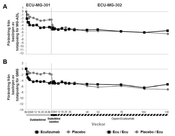 Det primära effektmåttet i studie ECU‑MG‑303 var förändringen från baslinjen i totalpoängen för QMG över tid, oavsett akut behandling. Pediatriska patienter som behandlades med Soliris visade en statistiskt signifikant förbättring från baslinjen i totalpoäng för QMG under hela behandlingsperioden för primär utvärdering på 26 veckor. Resultaten för de primära och sekundära effektmåtten i studie ECU‑MG‑303 visas i tabell 20.