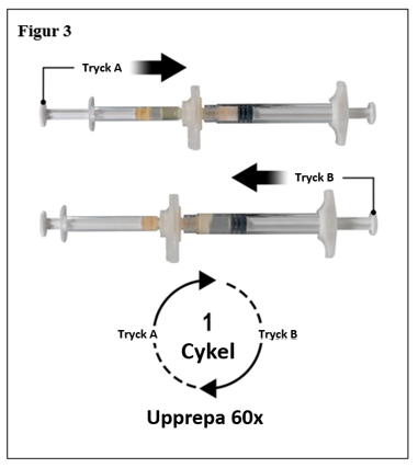Efter att ha blandat, håll sprutorna lodrätt med spruta B underst. Sprutorna ska fortsätta vara säkert ihopkopplade. Dra ner all blandad produkt i spruta B (bred spruta) genom att trycka ner kolven i spruta A och lätt dra tillbaks kolven i spruta B (figur 4).
